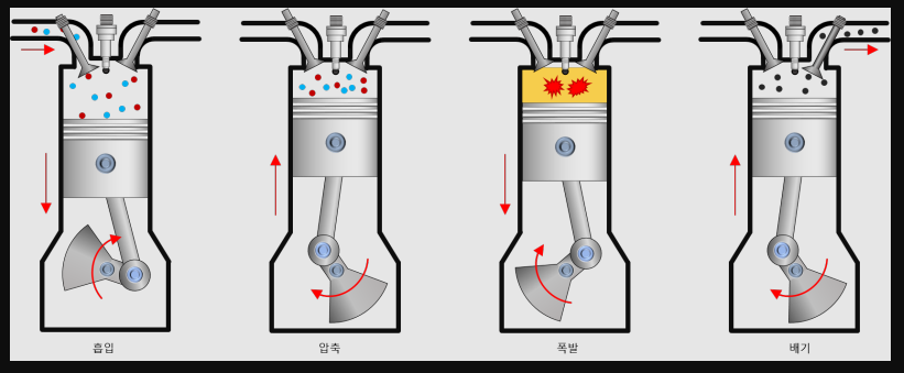 엔진의 작동 싸이클은 흡입 -> 압축 -> 팽창(폭발) -> 배기 순으로 이루어집니다. 흡입한 연료를 압축하고 폭발시켜 그 힘으로 피스톤이 상하운동으로 움직이며 바퀴로 동력을 전달하게 되는데요. 경유와 휘발유 모두 동일한 방식으로 이루어집니다. 하지만 폭발 방법에서 약간의 차이가 발생합니다.