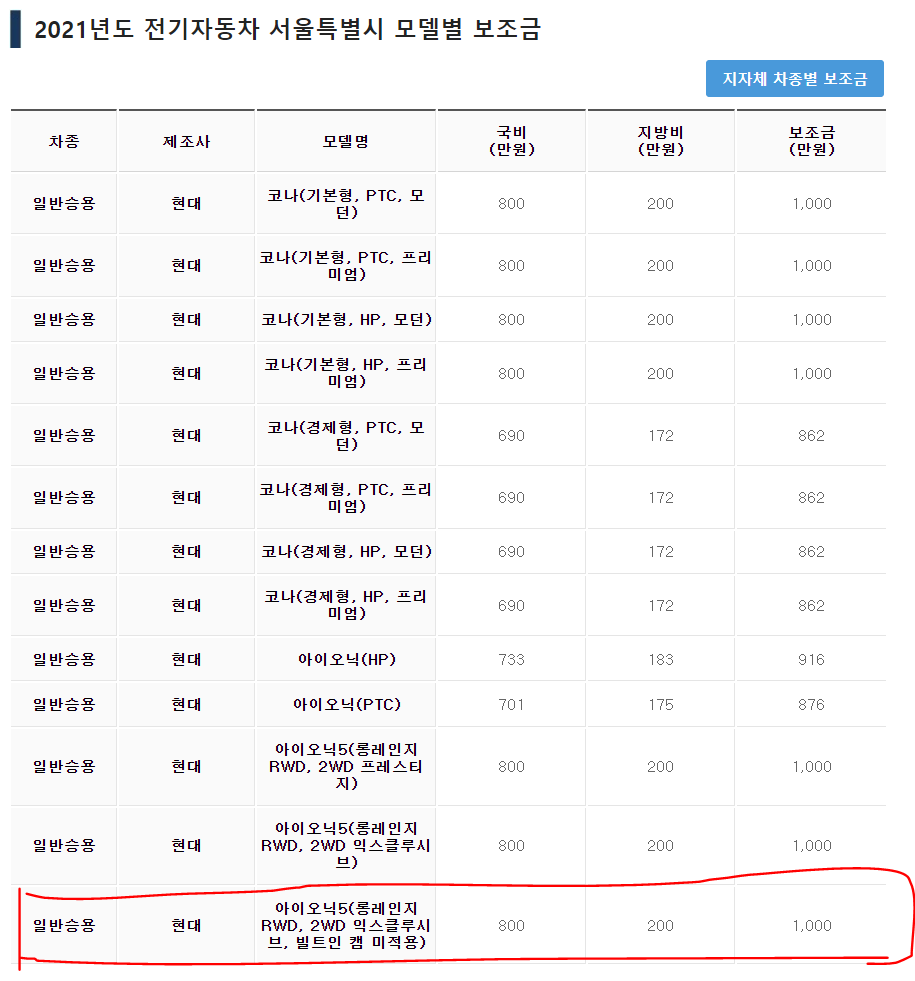 지자체 보조금은 지역별로 차이가 있는데요. 서울특별시 기준으로 최대 200만원 지원됩니다. 최근 출시한 모델별 보조금은 아래와 같습니다.