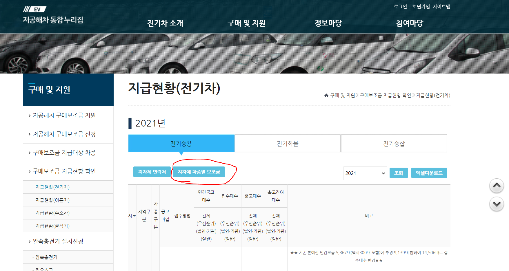 다음으로 아래 화면에서 '지자체 차종별 보조금' 을 눌러서 들어가줍니다.