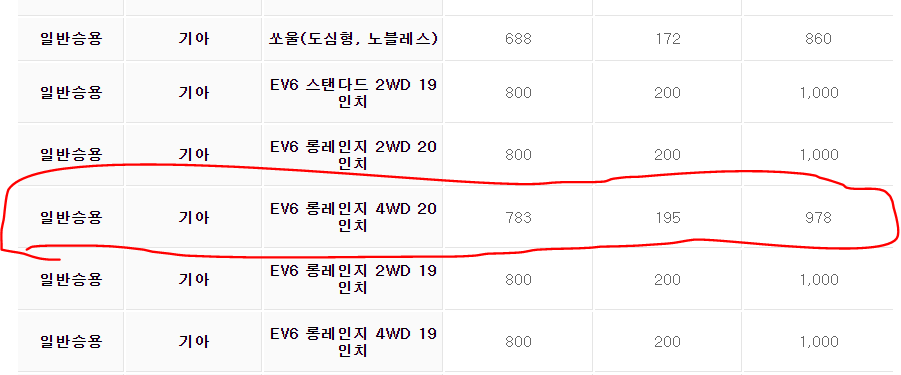 아래는 EV6인데요. 4WD(4륜 구동) 옵션이 포함된 차량은 국고 보조금 783만원, 지자체 보조금 195만원으로 최대 978만원 입니다. 최대 지급액에 비해 조금 낮은데요. 4륜은 전비가 조금 떨어지기 때문에 그렇습니다.