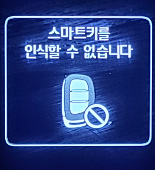 차 문을 열었다면 이제 시동을 걸어야 하는데요. 그냥 평소처럼 엔진 스타트를 눌러도 아래와 같이 시동이 걸리지 않을 텐데요. 왜냐하면 배터리가 없으니 스마트키를 인식할 수 없기 때문이죠. 하지만 인식 불가 해결방법은 쉽습니다. 스마트키로 시동 버튼을 직접 누르면 시동이 걸립니다.