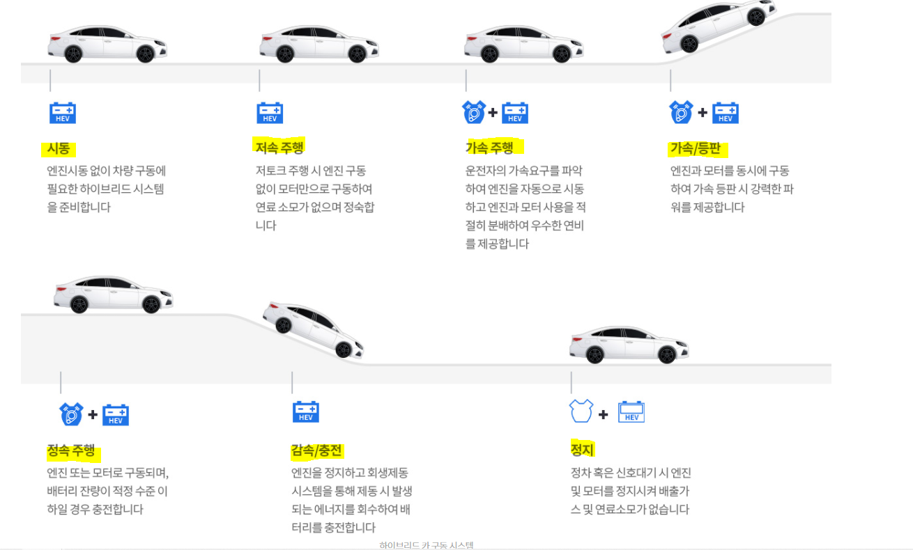 요약하자면 첫 번째로, 엔진의 효율이 좋지 않은 구간에서 모터가 개입하여 손실을 최소화해준다. 두 번째로, 감속 시 버려지는 에너지를 회수하는 회생제동 시스템 덕분입니다.