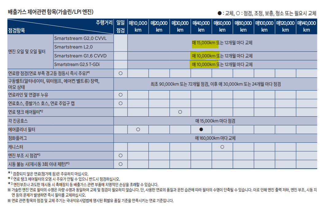가솔린 엔진은 터보냐 자연흡기냐에 따라 차이가 있습니다. 터보차저(T-GDI) 엔진은 1만 km, 자연흡기와 LPI 엔진은 1만 5천 km마다 교체해야 합니다.