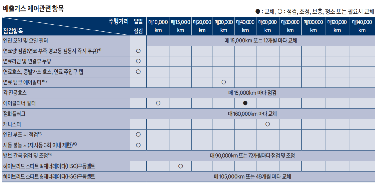 하이브리드차는 엔진오일 및 오일필터를 매 15,000km 또는 12개월마다 교체해야 합니다.