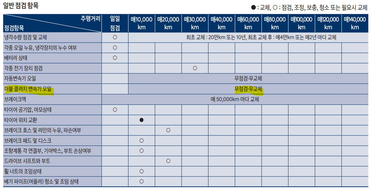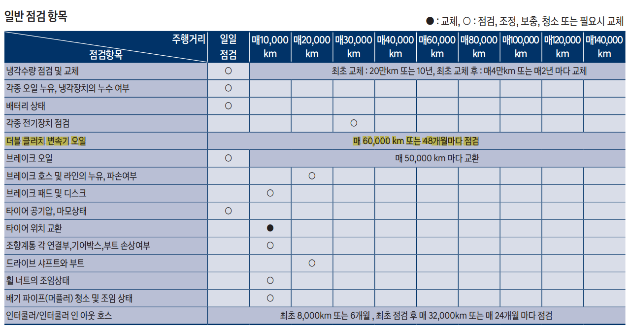 | 더블 클러치 변속기 | 무교체, 60,000km마다 점검 | 100,000km |