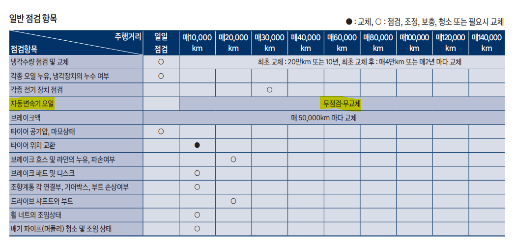 | 자동 변속기 | 무교체, 무점검 | 100,000km |
