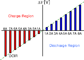 이러한 내부저항을 측정하는 방식중 하나가 DCIR(Direct Current Internal Resistence) 입니다. 배터리에 일정시간 동안 충방전 펄스를 가해주고 그때 변하는전압, 전류값을 옴의 법칙(R=(I/V))을 이용해 계산하여 환산하는 방식입니다.