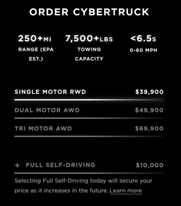 사이버트럭을 처음 공개한 2019년 당시 1회 충전 주행거리와 구체적인 성능을 포함한 가격도 함께 공개되었습니다. 실제로 사전예약 페이지에도 가격이 있었죠. 트럭임에도 불구하고 엄청난 성능을 보여줬으며 주행거리 역시 엄청났습니다.