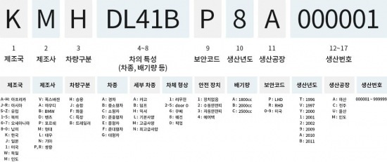 이러한 고유번호에는 제조국가, 자동차 제작회사, 차량종류, 세부차종, 차체형상, 안전장치, 확인란, 생산공장 등 다양한 정보들이 담겨져있습니다. 차대번호 조회를 통해 생산 당시 정보 및 옵션까지 전부 알 수 있기 때문에 매우 중요한 정보라고 보시면 되겠습니다.