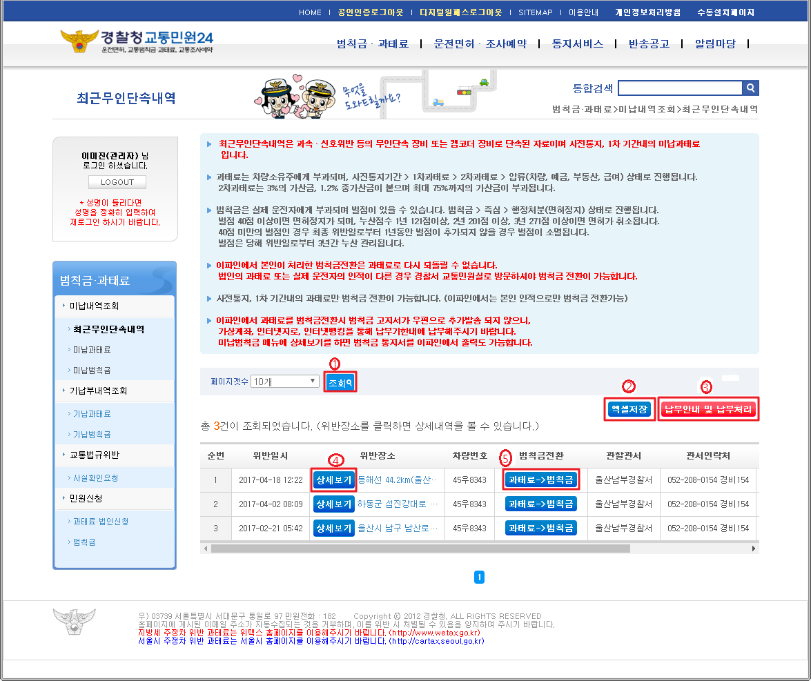 경찰청교통민원24(이파인) 홈페이지에 접속하면 속도위반 과태료 범칙금 조회와 납부를 할 수 있습니다.