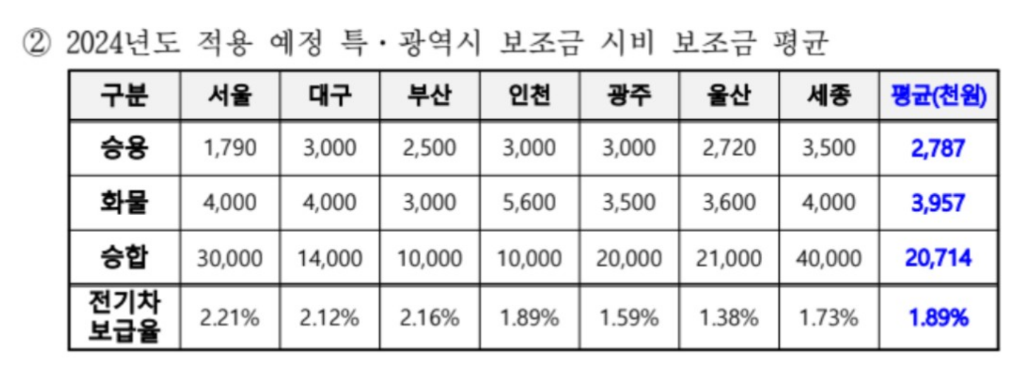 서울 180 → 179만원, 부산 300 → 250만원, 대구 350 → 300만원, 인천 350 → 300만원, 광주 390 → 300만원, 대전 350 → 300만원, 울산 340 → 272만원, 세종 400 → 350만원으로 최저 1만 원에서 최대 90만 원이 감액될 예정입니다. 결과적으로 2024년 전기차 보조금 총액은 위 표에 나타난 시비에 400만 원을 더해주시면 최대 지원 금액이 나오게 됩니다.
