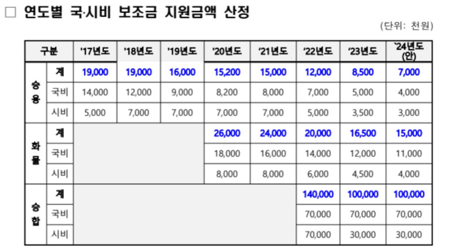 다만, 위에서 말한 500만원은 성능보증금을 의미합니다. 이외에 각종 보조금을 더하면 현행 최대 국비 보조금은 680만 원입니다. 따라서, 2024년에도 최대 국비 보조금은 580만 원 내외로 된다고 보시면 되겠습니다.